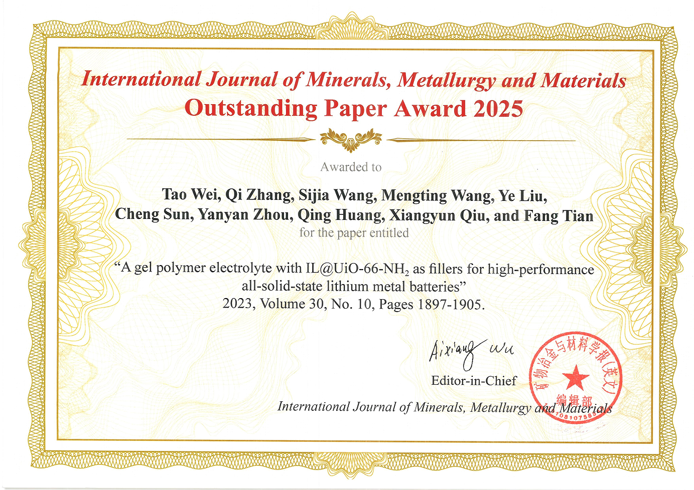 2、“A Gel Polymer Electrolyte with IL@UiO-66-NH2 as Fillers for High-Performance All-Solid-State Lithium Metal Batteries”获“Outstanding Paper Award”(图2,https://doi.org/10.1007/s12613-023-2639-0);