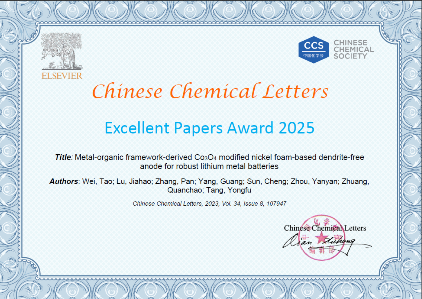 3、“Metal–organic framework-derived Co3O4 modified nickel foam-based dendrite-free anode for robust lithium metal batteries”获“Excellent Papers Award”(图3,https://doi.org/10.1016/j.cclet.2022.107947)