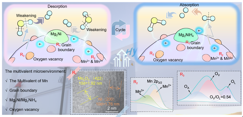 MgH2 is particularly noteworthy in metal solid-state hydrogen storage households due to its outstanding hydrogen storage capacity (7.6 wt%, 100g/L). Nevertheless, the pronounced electrostatic attraction between Mg2+ and H- stabilizes MgH2, trapping hydrogen in a low-energy configuration from which it is reluctant to escape. Weakening the electrostatic attraction between Mg2+ ions and H- ions in MgH2 is vital for improving the kinetic performance of MgH2 for hydrogen storage. Herein, a multivalent microenvironment is synergistically created by Mn and Mg2Ni to break the stable structure of MgH2, enabling rapid and stable de/hydrogenation performance. Specifically, the catalyzed MgH2 system rapidly emits 5.98 wt% H2 at 265 °C within just 20 min and swiftly absorbs 6.24 wt% H2 at 150 °C in a mere 10 min. Microscopic characterization shows that a tight interface is formed between Ni and Mn2O3, which provides a stable anchor point for the formation of hydrogen pumps. Additionally, the multivalency of Mn and abundant oxygen vacancies accelerate the electron transfer and provide the shortest path for H dissociation. Moreover, Density functional theory (DFT) indicates that Mg-H is extracted from 0.173 to 0.204 nm after modification, achieving a reduced decomposition energy of MgH2. Besides, 97.8% reversible hydrogen storage capacity was maintained after 30 cycles, presenting prominent potential for practical.