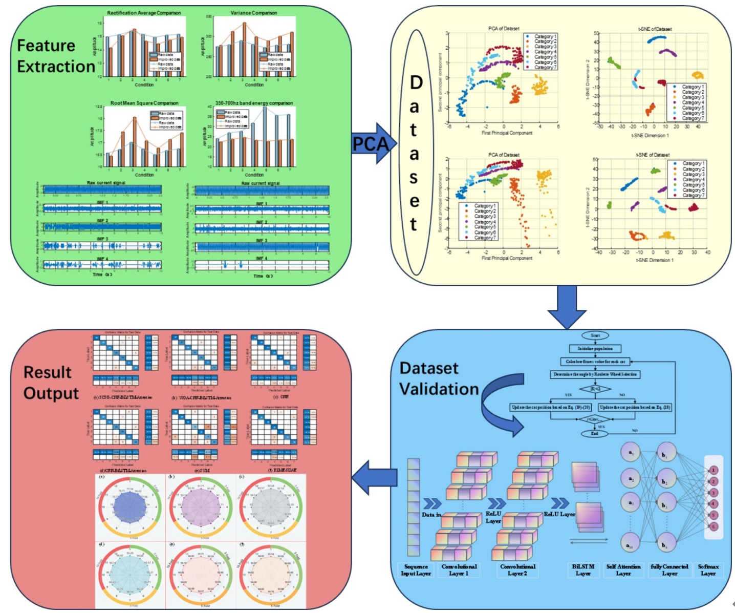为了推进泵电系统转子健康监测的测量方法,本研究提出了一种新型非侵入式测量框架,将马达电流特征分析(MCSA)与混合深度学习相结合。该方法通过循环自相关函数(CAF)和经验模式分解(EMD)来量化能量熵变化,从而解决了信号噪声抑制和不确定性传播等关键计量学挑战。主成分分析(PCA)被严格应用,以降低特征维度,同时保持测量完整性。提出了一种新颖的SCSO-CNN-BiLSTM-注意力模型,结合了CNN的空间特征提取、BiLSTM的时间依赖建模和基于注意力的关键权重,并通过沙猫群优化(SCSO)优化,用于具有可追踪不确定度预算的超参数调优。该模型在七种故障条件下验证,测试准确率达到95.24%,在计量鲁棒性和计算效率方面均优于传统方法。关键创新包括IMF1的高频灵敏度和IMF4的低频判别能力。T-SNE可视化确认了通过整合的RMS和IMF熵特征增强了聚类。尽管空蚀耦合断层存在残留误差,该框架仍展现出稳健的泛化性和实时潜能。这项工作为离心泵健康监测提供了基于物理的人工智能解决方案,平衡诊断精度与计算效率,应用于工业部署。
